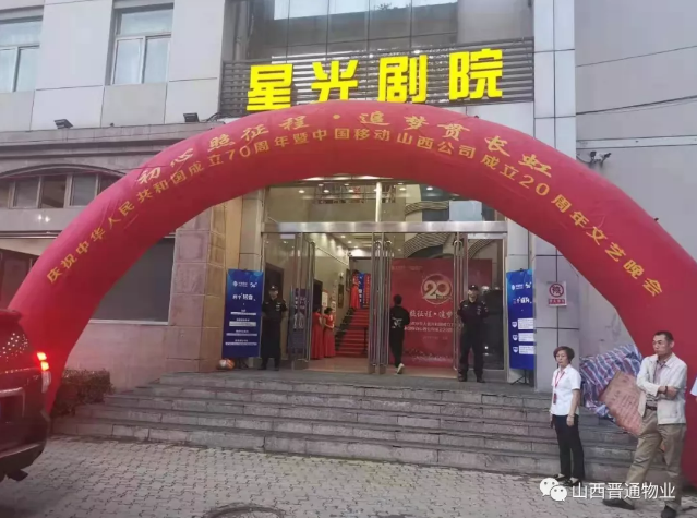 为庆祝祖国70周年、中国移动山西公司成立20周年,山西移动特举办大型庆典活动,为保障甲方活动的顺利举行,太原经济区分公司各部门严阵以待,提前进行计划部署并进行会场服务演练。在2019年9月10日进行的文艺晚会“初心照征程·追梦贯长虹”中,外派客服、安保人员进行现场支撑,部门主管全程跟进现场服务,以防突发事件的发生,保障庆典的顺利开展。此次晚会结束后,现场服务表现受到业主的一致好评。
