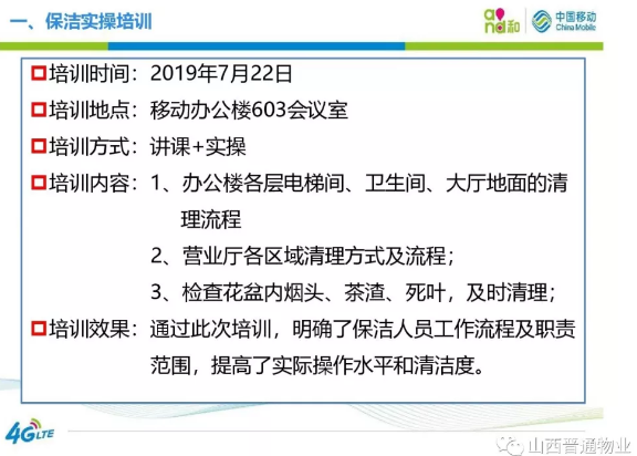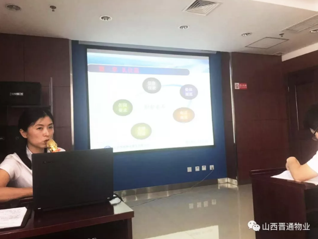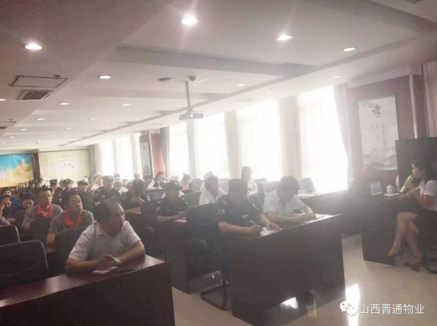 2019年7月19日运城分公司组织客服接待、安保、维修、保洁、餐厅等人员在会议室进行综合基础知识培训,包括企业文化、礼貌礼仪、公司制度、各项安全知识等。
