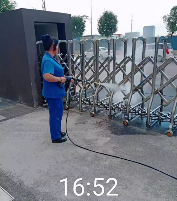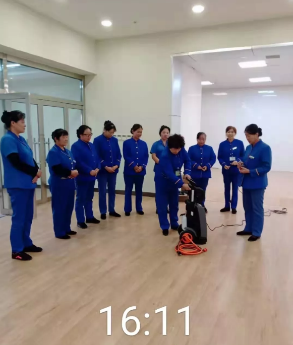 经过一个小时的不断学习,大部分人员基本掌握设备使用要领并应用自如。随后大姐们通过清洁如新的大门伸缩门,来验证所学的技能。